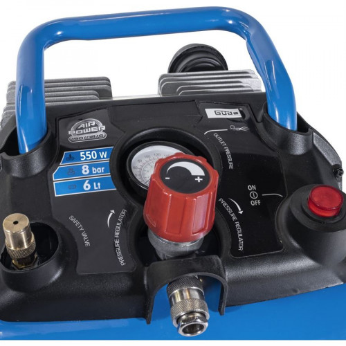 Vybavení: manometr (měření pracovního tlaku), 1 výstup stlačeného vzduchu (kovová rychlospojka), tlakový spínač, pojistný přetlakový ventil, přepravní držadlo.