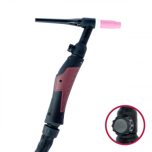 Svářecí hořák TIG s ventilkem pro ovládání průtoku ochranného plynu, bez tlačítka a ergonomickou rukojetí.